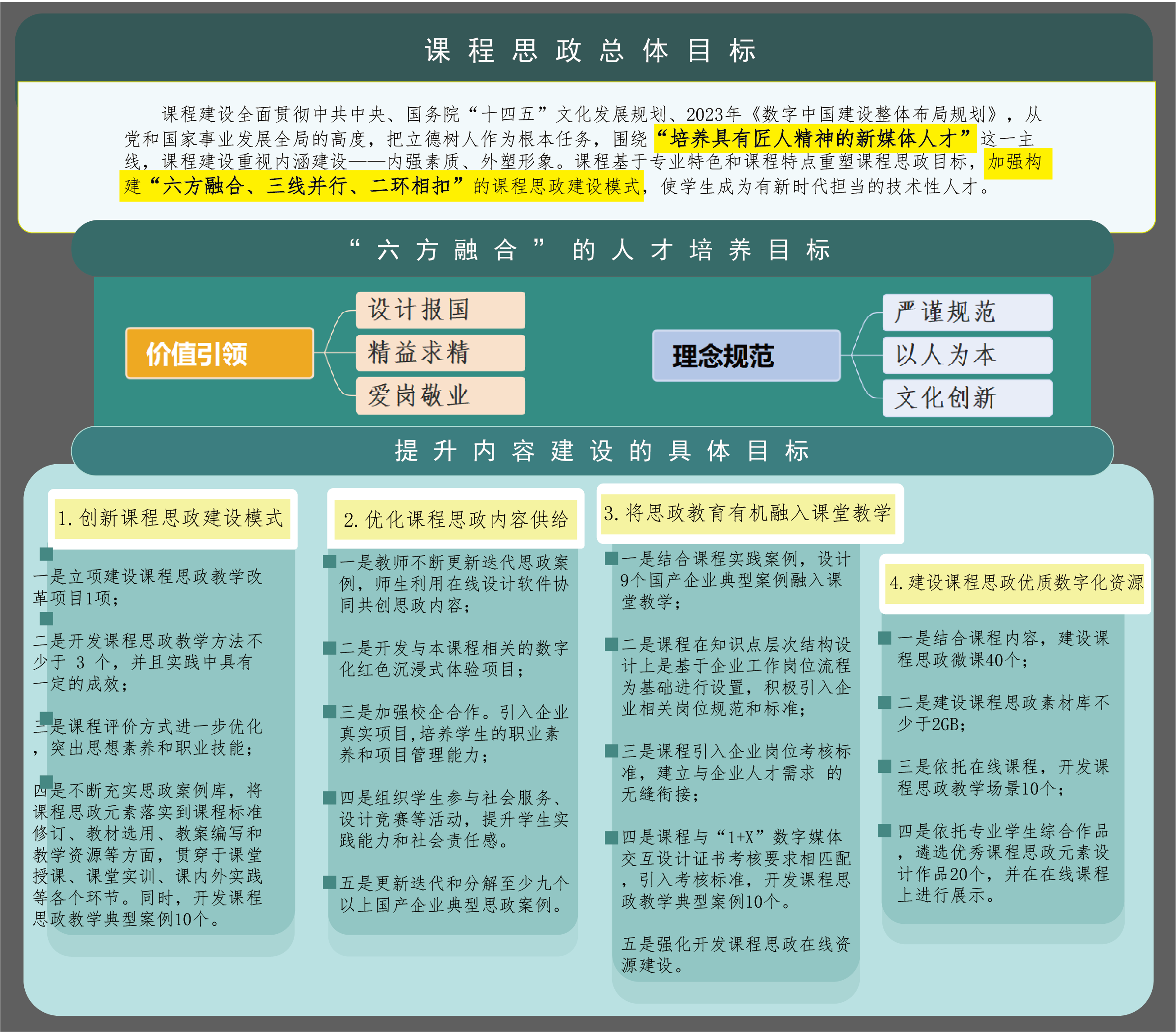 课程建设全面贯彻中共中央、国务院“十四五”文化发展规划、2023年《数字中国建设整体布局规划》,从党和国家事业发展全局的高度,把立德树人作为根本任务,围绕“培养具有匠人精神的新媒体人才”这一主线,课程建设重视内涵建设——内强素质、外塑形象。课程基于专业特色和课程特点重塑课程思政目标,加强构建“六方融合、三线并行、二环相扣”的课程思政建设模式,使学生成为有新时代担当的技术性人才。......