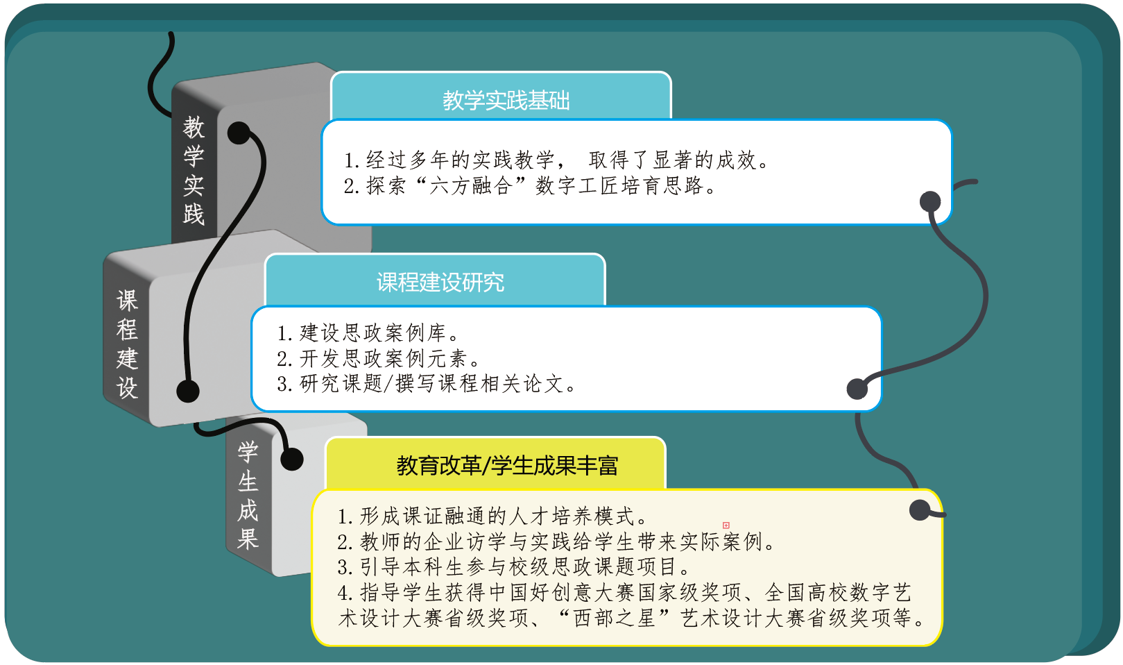 课程负责人于 2020 年开课至今,承担了多门与交互设计相关的课程,为了探索本课程思政的内容体系,首先从“在文化自信中培育数字工匠”的教学思路引导学生进行了众多主题项目的实践,为课程思政的构建积累了丰富经验。本课程作为数字印刷工程高水平专业群中数字媒体技术职业本科的专业核心课程,从 2020 年在数字媒体技术职业本科专业进行开设,目前已经过 4 年的教学与建设,建设了 ...