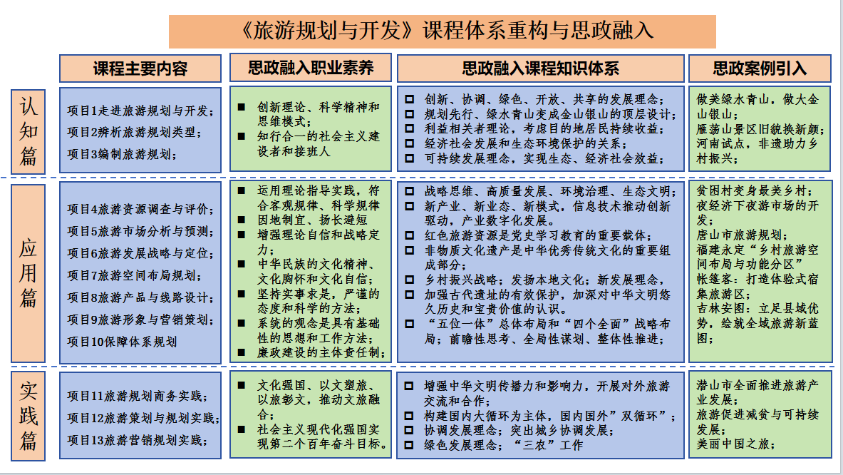旅游规划与开发课程思政的教学方法和模式主要包括:一是教师讲授法。教师课上精讲重点内容和核心知识点。结合旅游规划有关内容,强调全局观、系统观、发展观思考问题的重要性。强调战略规划的重要性等。二是案例分析法。根据具体章节内容选取典型热点案例,学生阅读、分析、总结、 评价真实的旅游规划案例,从而学习旅游规划的框架内 容确定、规划方法、技能以及如何进行规划的创新。结合国内外的实际案例, 让学生树立可持续发 ...