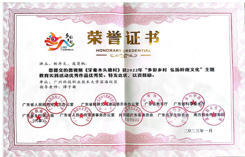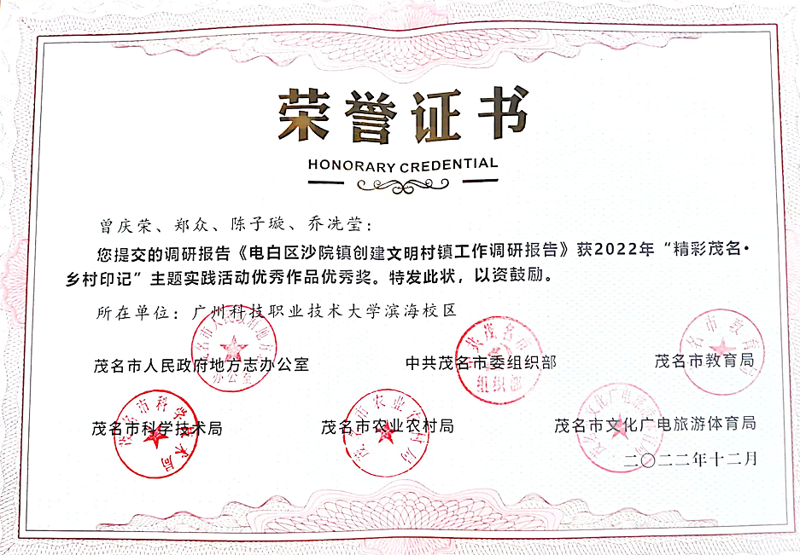 通过实践活动,广科大滨海校区师生共创作乡村振兴调研作品30多个,包括海报5个、摄影14组、视频13个、微信推文6篇、调查报告1篇。微信推文作品《风里雨里 桥头等你 ——元坝桥头村》 获茂名市二等奖,调研报告《电白区沙院镇创建文明村镇调研报告》获茂名市优秀奖,微视频作品《牙象村木头塘村》获广东省2022年“多彩乡村 弘扬岭南文化”主题实践优秀作品奖。华亿在线滨海校区由此也获得2022年“精彩茂名·乡村印记”主题实践活动“优秀组织奖”。