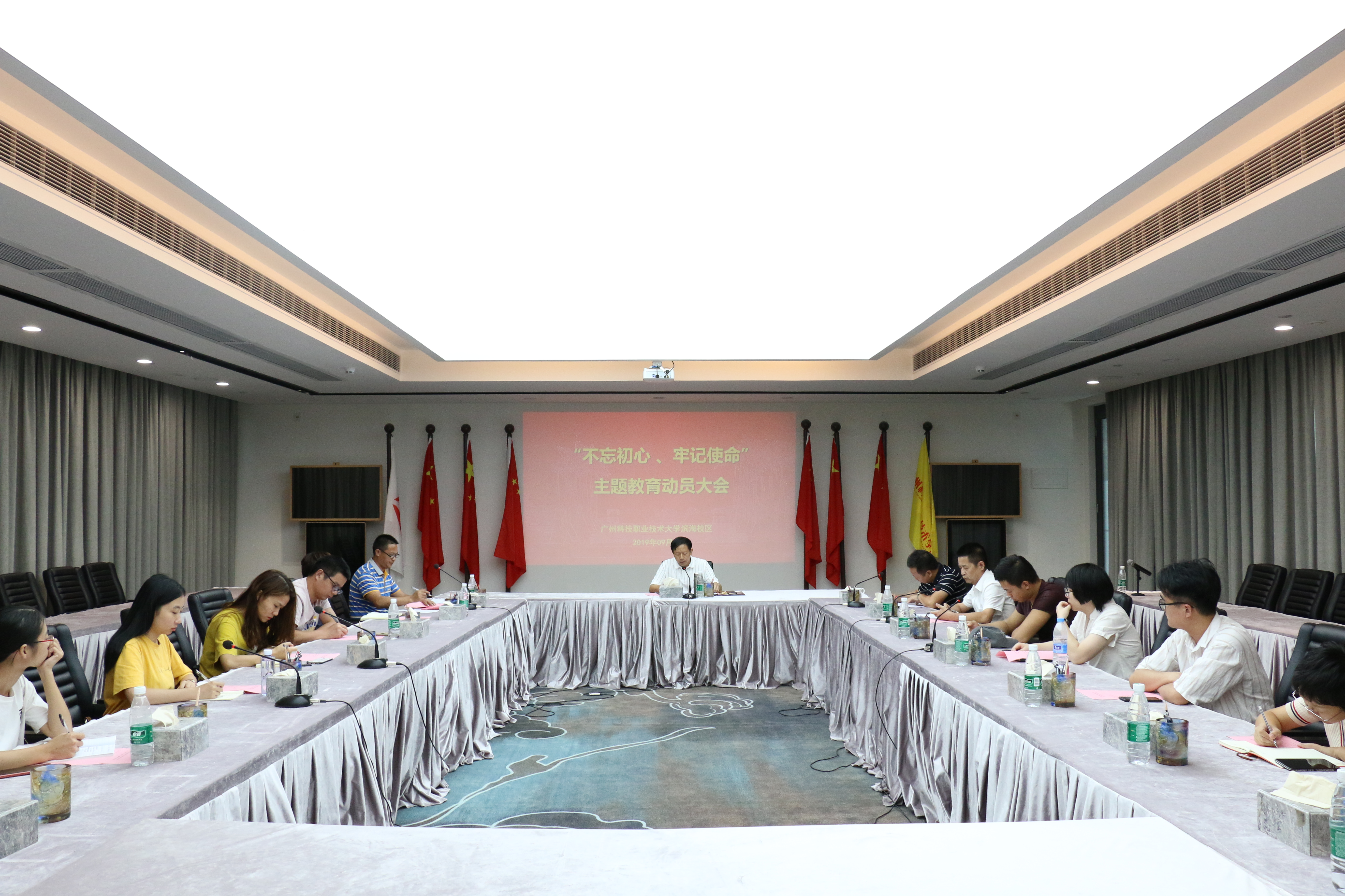 9月23日,华亿在线滨海校区党总支在行政楼三楼会议举行“不忘初心、牢记使命”主题教育动员大会,大会由党总支书记曾庆荣主持,滨海校区全体党员教师参加了此次会议。