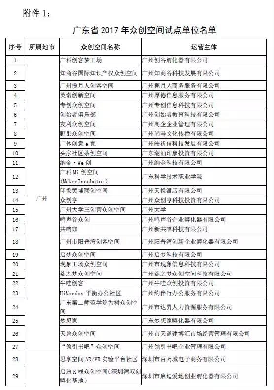按照国家科技企业孵化器和众创空间建设发展的总体要求,根据《广东省科学技术厅关于开展2017年度广东省众创空间试点单位 国家级孵化器培育单位认定的通知》(粤科函高字〔2017〕777号)工作安排,经各地科技主管部门推荐,省科技厅通过形式审查、专家评审、部分单位现场考察等程序,确定98家单位为广东省众创空间试点单位,48家单位为国家级科技企业孵化器培育单位。