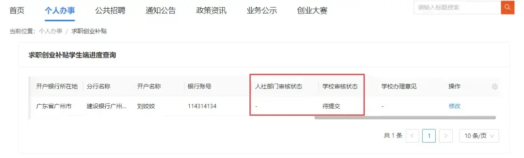 2. 求职创业补贴学生端进度查询界面,可查看本人保存或提交的求职创业补贴申请,以及查看学校审核状态、人社部门审核状态。对于学校退回的记录,可查看学校退回意见,并进行修改。