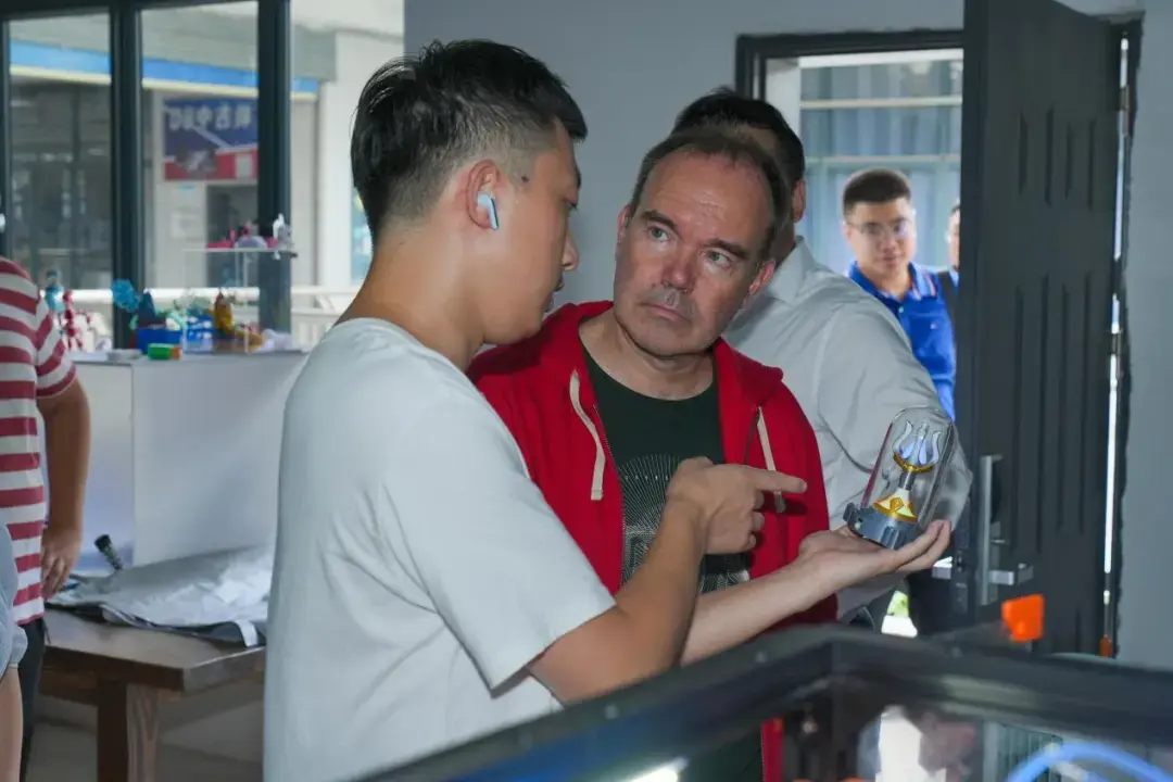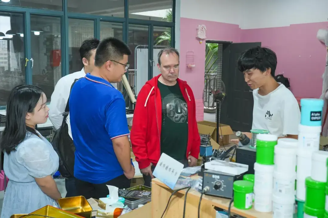 随后,他步入我校国家备案众创空间——创客梦工场,与这里的创业团队进行了亲切的交流。从广州格桑花艺设计有限公司的创意花卉艺术,到广州众鑫科技文化传媒有限公司的数字营销策略;从广州光绘传媒有限公司的影视制作技术,到广州蛙小妍科技有限公司的互联网+文创;再到广州铖芯微科技有限公司的人工智能计算加速卡,以及广州熔创三维技术有限公司的3D打印技术展示,御鲸商业发展(广州)有限公司供应链结合电商平台零售批发;每一个团队都以其独特的创新精神和市场洞察力吸引了Peter的注意。他认真听取了各团队的创业故事,分享了自己的创业经验和见解,鼓励大家要坚持不懈,勇于挑战自我,不断突破自我限制。