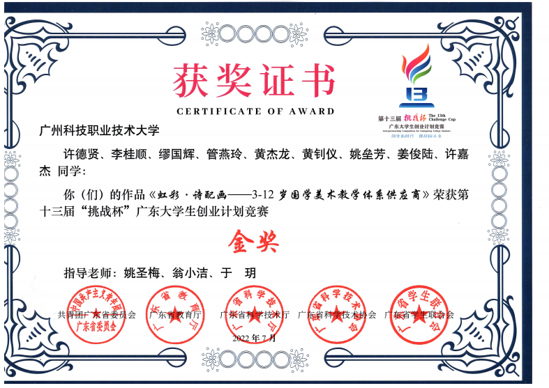 学校领导高度重视创新创业工作,为进一步做好创新创业大赛指导与备赛工作,安排了多场线上线下结合的专题辅导讲座,为大赛的备赛工作给予了充分支持。我校参赛项目“虹彩·诗配画—3-12岁国学美术教学体系供应商”和“年轮新媒体—学院型MCN”分别荣获第十三届“挑战杯”中国大学生创业计划竞赛金奖和银奖!两个项目团队克服困难、积极备赛,在华亿在线指导老师们的带领下对各自项目进行细致的打磨。经过大家的共同的努力,最终取得了本次优异成绩。