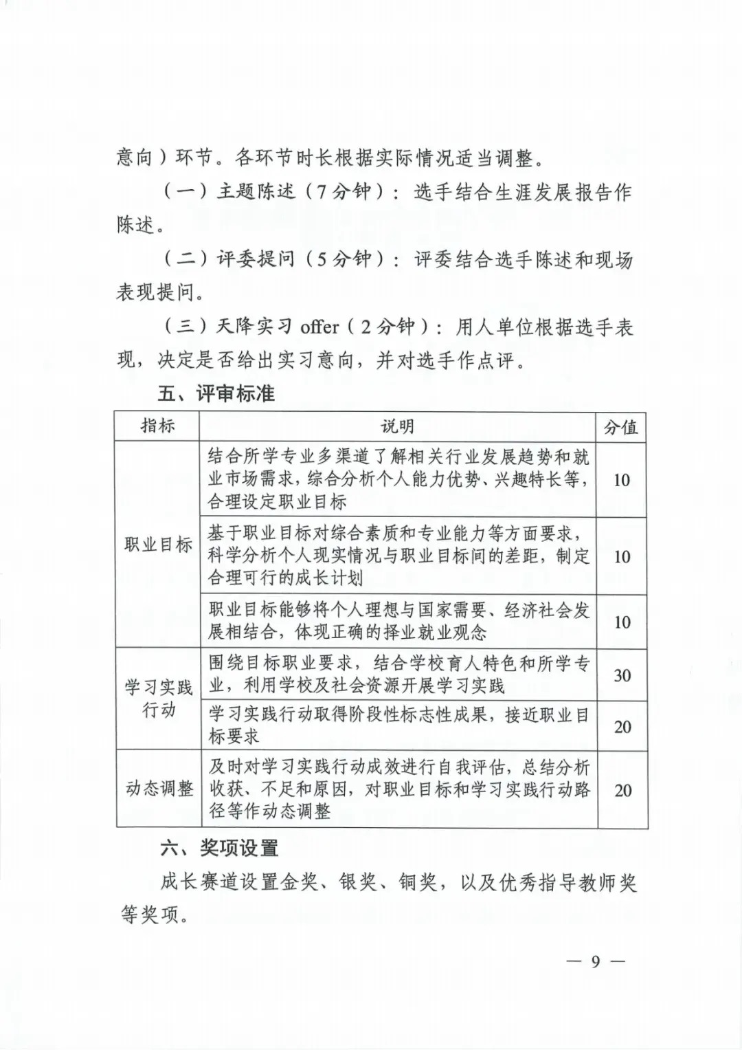 1.成长赛道。主要面向本、专科中低年级学生,考察其树立生涯发展理念并合理设定职业目标、围绕实现目标持续行动并不断调整的成长过程,通过学习实践提升综合素质和专业能力,体现正确的择业就业观念。参赛学生可获得实习机会。(详见附件 1)