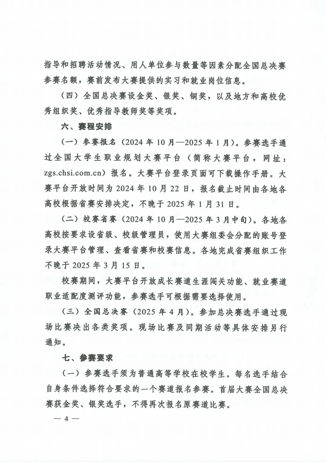 (一)参赛报名(2024年10月-2025年1月)。参赛选手通过全国大学生职业规划大赛平台(简称大赛平台,网址:zgs.chsi.com.cn)报名。大赛平台登录页面可下载操作手册。大赛平台开放时间为2024年10月22日,报名截止时间由各地各高校根据省赛安排决定,不晚于2025年1月31日。