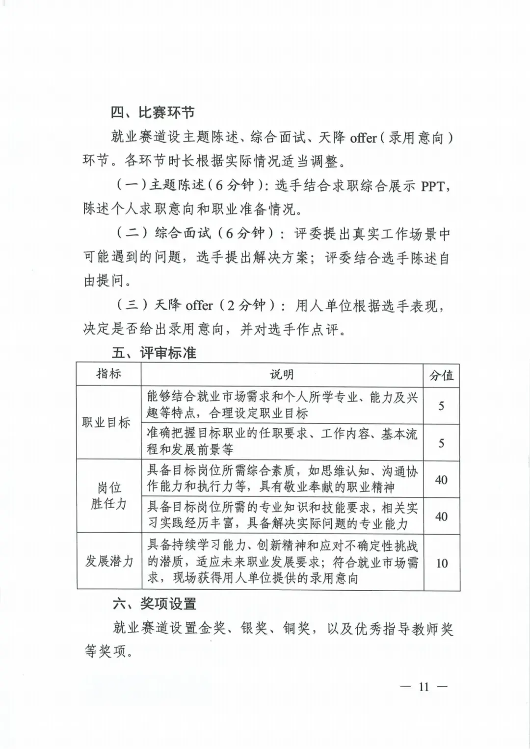 2.就业赛道。面向本、专科高年级计划求职学生(不含已通过推免等确定升学的毕业年级学生)和研究生,考察其求职实战能力,对照目标职业及岗位要求,个人综合素质和专业能力等方面的契合度,个人发展路径与就业市场需求的适应度。参赛学生可获得岗位录用意向。(详见附件2)