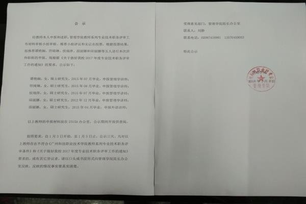 按照要求,自1月3日开始,至1月5日止,公示三天。凡对以上教师存在不符合《广州科技职业技术学院教师系列专业技术职务评审条件》和《关于做好我校2017年度专业技术职务评审工作的通知》要求的,或有其它异议者,请以口头或书面形式向管理学院院长办公室反映。反映的情况事实要真实清楚。
