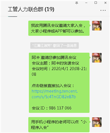 2020年4月1日晚上,工商企业管理教研室联合人力资源管理教研室召开网络会议。会议采取腾讯会议的方式。会议的主要内容是结合刘静院长3月30日召开的专业主任会议精神,布置教研室4月份主要工作任务。会议于20:00准时开始,由人力资源管理教研室主任谭艳娴老师发起考勤签到,由工商企业管理教研室主任谢晓冲主持。