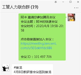 2020年4月8日晚上,工商企业管理教研室联合人力资源管理教研室召开网络会议。本次会议是4月份以来第二次教研室工作例会。会议于20:00准时开始,由人力资源管理教研室主任谭艳娴老师发起考勤签到,由工商企业管理教研室主任谢晓冲主持。谢老师结合刘静副院长4月8日下午召开的专业主任会议精神,布置接下来一段时间教研室的主要工作任务。