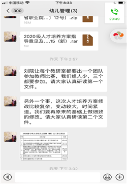 2020年5月21号晚上8点,幼儿教研组在微信群准时开始语音交流会, 会议由许丹娜老师主持。会议议程包括:关于组织开展2020年全省职业院校技能大赛教学能力比赛校内选拔赛的通知的内容讨论、2020级人才培养方案指导意见中需要结合进行适度修改的部分探讨、本学期专业建设的建议。