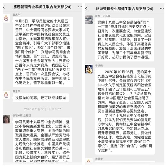 2020年11月30日,经济与管理学院旅游管理专业群师生联合党支部开展了支部成立后的第一次主题党日活动,活动主题是“学习十九届五中全会精神”。本次活动通过网络交流的方式开展,由支部书记黄思华主持。会上,支部各位党员敞开心扉,踊跃发言,谈了各自在学习十九届五中学会精神后的心得体会。