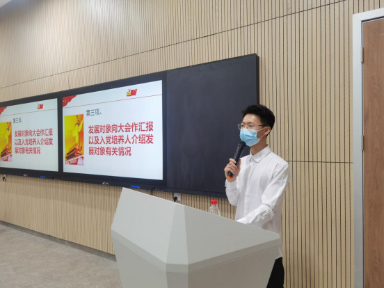出席此次会议的主要人员有由党总支组织委员袁艳萍同志、国贸党支部孙秀同志、国贸党支部组织委员蒋国春同志、教师党员以及学生党员。随后在主持人宣读2021年上半年吸收预备党员名单后,发展对象逐一上台进行思想汇报工作以及入党介绍人介绍发展对象的有关情况。