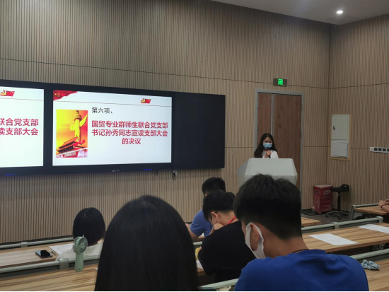 图为国贸党支部书记孙秀同志宣读支部大会的决议