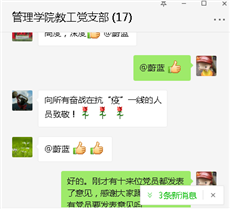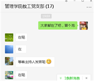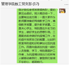 2020年2月27日晚, 管理学院教工党支部召开支部组织生活会。本次会议主题为“疫情当前,教师党员如何体现先进性”。由于当前处于新冠肺炎疫情期间,支部成员不能当面开会,因此利用网络和支部微信群召开了别开生面的一次网络会议。本次参会的党员为教工支部全体在岗党员。会议由支部书记谢晓冲主持。