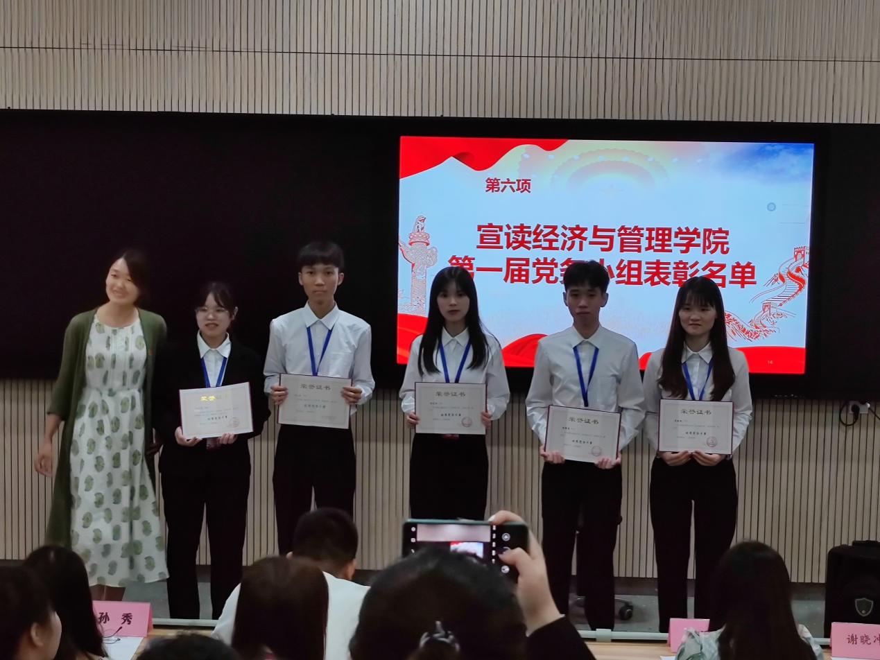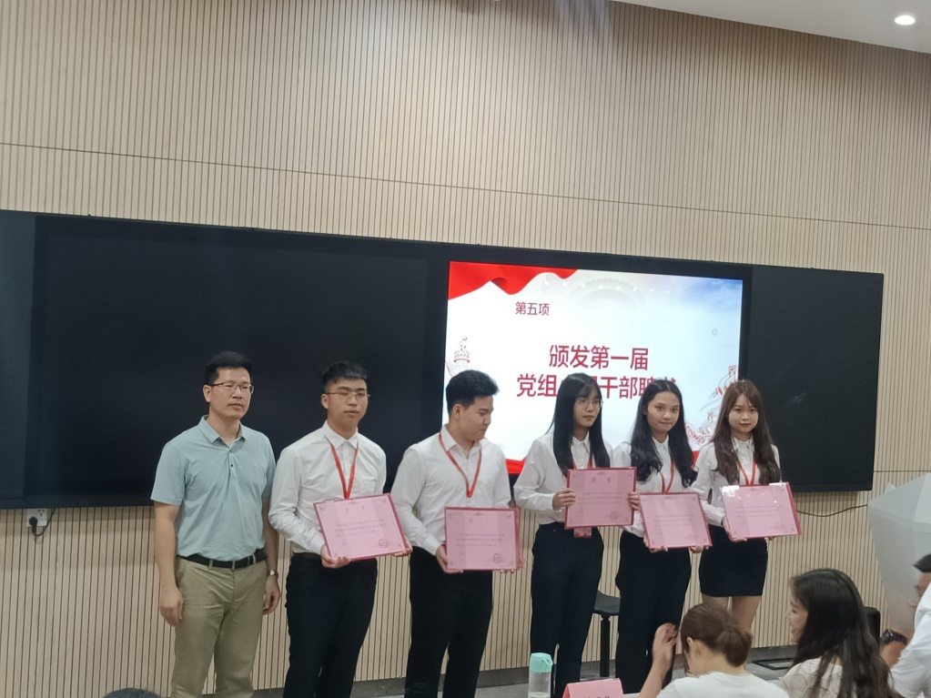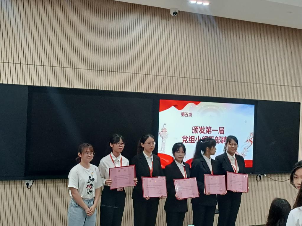 第五项议程由李冉同志为第一届会计支部党务小组颁发聘书、由谢晓聪同志为第一届工商管理支部党务小组颁发聘书、由黄思华同志为第一届旅游管理支部党务小组颁发聘书、由孙秀同志为第一届国贸支部党务小组颁发聘书。