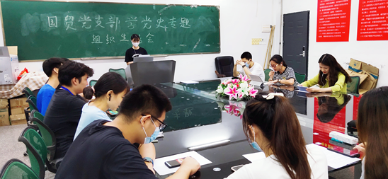为深入学习了解习近平总书记在党史学习教育动员大会上的讲话精神、关于党的历史和革命传统的重要论述、在庆祝中国共产党成立100周年大会上的讲话精神。国贸专业群师生联合党支部于2021年7月3日晚上19时在2315教室召开了线上线下相结合形式的学党史专题组织生活会。本次会议由覃华容同志主持,经管学院党总支书记刘静同志、国贸党支部全体师生党员参加了本次会议。