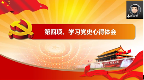 会议的最后由党支部书记孙秀同志作会议总结表示:历史是最好的教科书,常学常新;党史是最好的营养剂,催人奋进。回顾党的百年光辉历程,延续党的精神血脉。今年是建党100周年,站在百年的历史交汇点上,我们不应该忘记百年来共产党人艰苦奋斗的历史。一代又一代的中国共产党人,为了中国人民的利益,不惜牺牲自己的生命,换来了我们今天的幸福生活。在这个新的时代,我们要学习党史,学习共产党人坚强不屈的意志,全心全意为人民服务的精神。保护好祖国的大好河山,为了更好地沿着共产党百年的的足迹继续走下去,努力,加油!