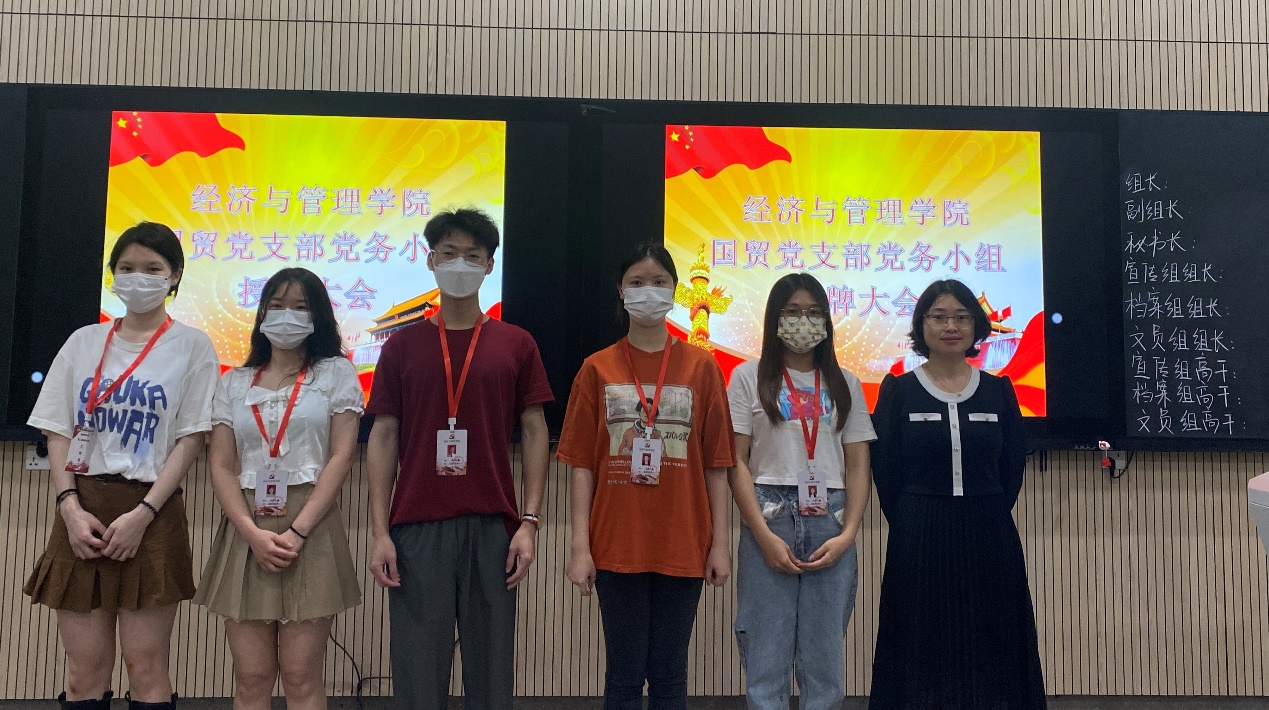 图为国贸党支部书记成亭锋同志(右一)与国贸党务小组干部合影