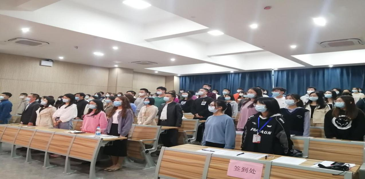 在主持人邓莹同志的指引下,全体成员起立,庄严面向五星红旗。国歌响起,全场肃静,昂扬奏唱国歌。奏唱国歌的同时,党员同志们的使命感、自豪感油然而生,大会帷幕在庄严的国歌声中拉开了。