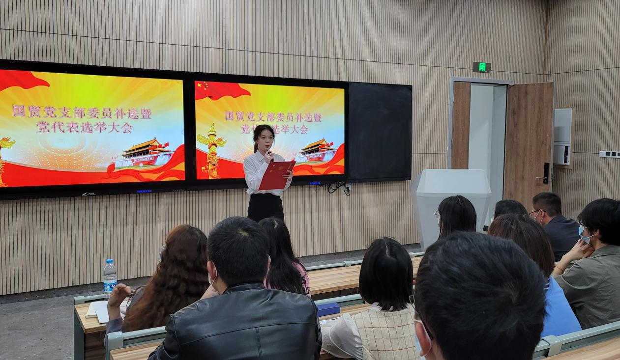图为国贸党支部党总支书记刘静同志宣读党支部委员补选决议