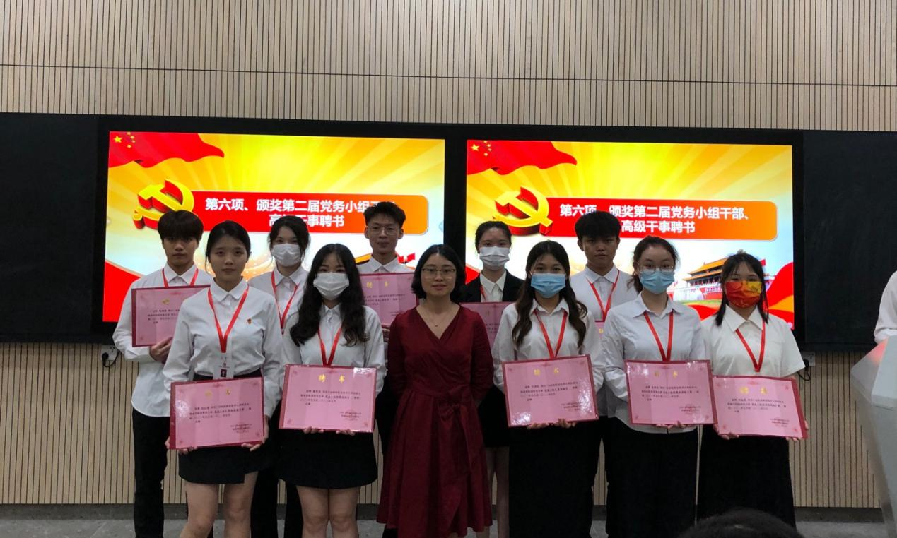 图为党支部组织委员张雯婧同志(右一)为第二届党务小组优秀干部颁发证书