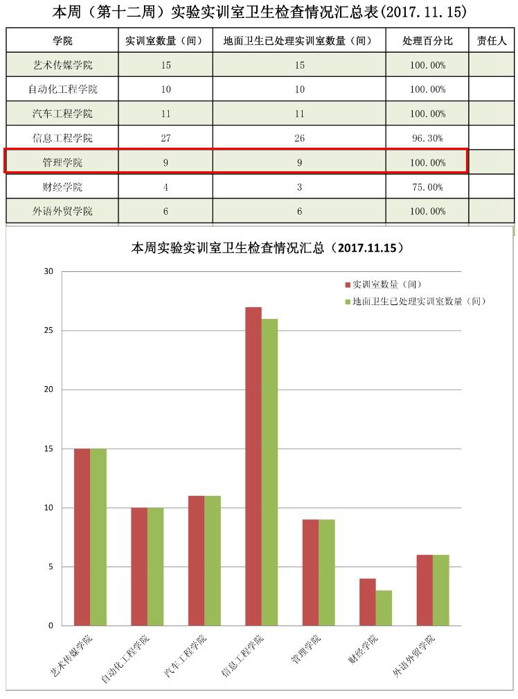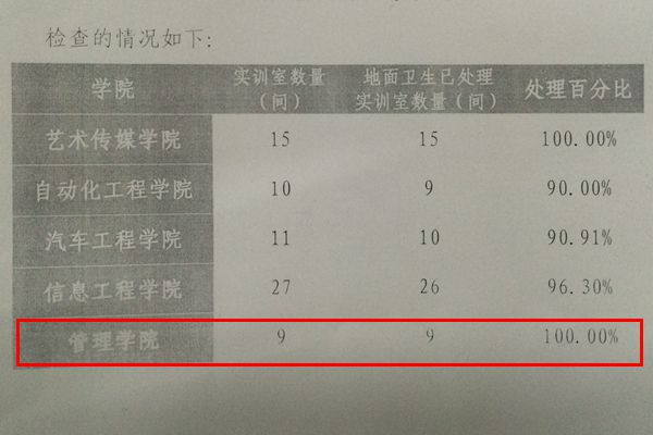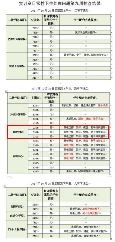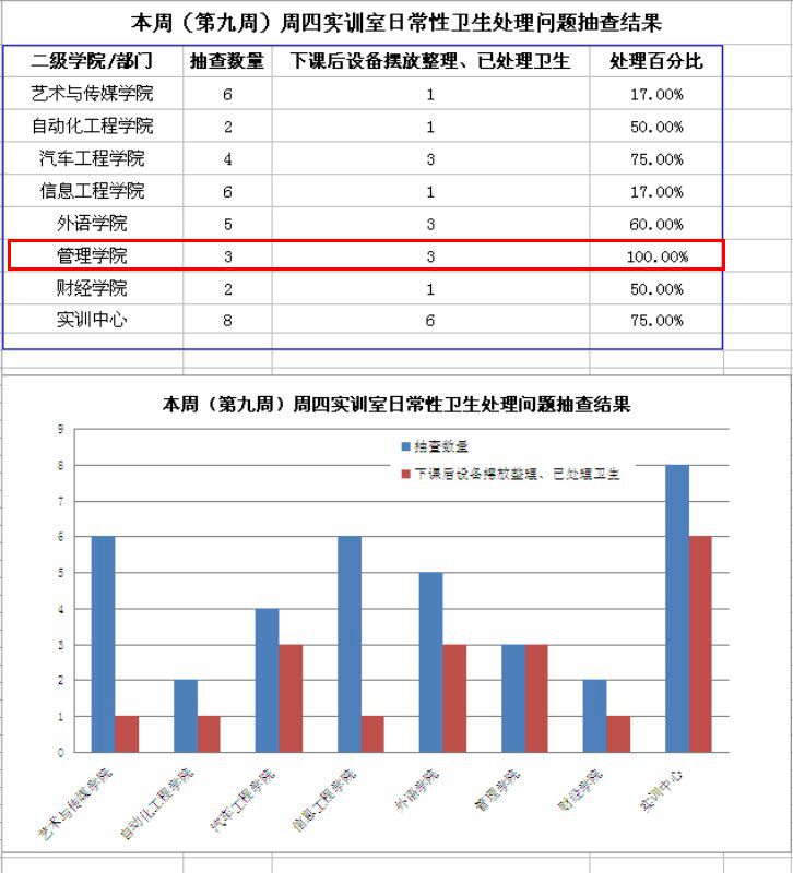 下面是实训中心发布的各学院的卫生检查抽检结果: