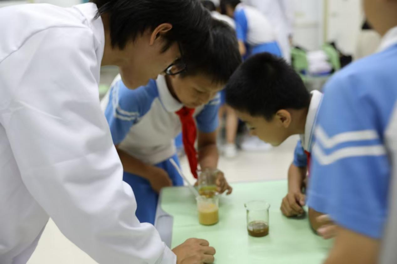 随后的核心环节由学生汪天昊主导,他带着团队精心设计的 “五倍子趣味科普实验”登场,用三个直观易懂的操作揭开中药原理的神秘面纱,“以药作画”:孩子们用玻璃棒蘸取五倍子提取液在纸上自由涂鸦,原本浅棕色的痕迹在喷洒三氯化铁溶液后瞬间变为深墨色;“蛋清止血”:提取液使蛋清凝固成絮状沉淀,直观模拟单宁酸凝固蛋白质的止血机制;“明胶解密”:单宁酸破坏明胶分子氢键,液态胶水无法凝固,揭示中药作用原理。
