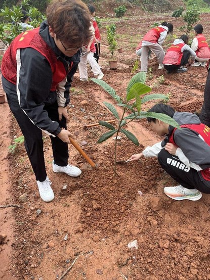 下午,学生按10人一组分为5队,分别认领5-10号种植区域,开展“一对一”中草药种植实践。各组在严志云老师的指导下,完成土地翻整、种苗移栽、标识牌制作与生长档案建立。从测量株距行距到调配基肥,从定植操作到灌溉记录,学生们在汗水中体悟“纸上得来终觉浅”的真谛。2班学生陈同学表示:“亲手种下余甘子苗时,才真正理解课堂上讲的‘根系舒展’‘定植深度’有多重要,这样的实践让我对中药材种植有了更立体的认知。”