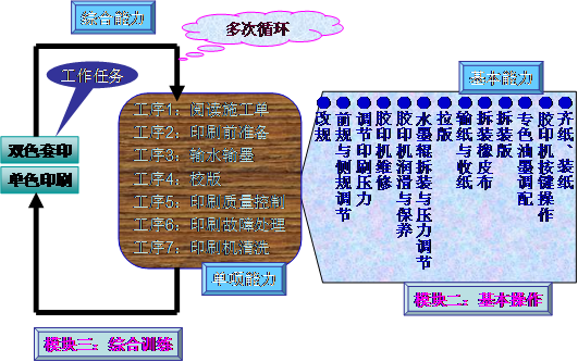把工作任务分解成许多工作项目,分别对各个项目进行单独训练与学习,把岗位要求细化为具体的教学项目,对各个项目进行教学,先理论后实训或者边理论边实训,在单项技能掌握的基础上再进行综合技能训练。在本课程中,把平版印刷基本操作项目归纳到一起,进行单项教学与训练,在学会各单项操作的基础上再进行综合性较强的印刷操作,印刷操作又分为单色印刷与多色印刷,最后通过顶岗实习进行产品印刷,先易后难,先简后繁,先单项后综合的渐进式教学法。在教学中“教、学、做”相结合,在做中学,在学中做,边教边学,边做边学,理论与实操一体化。在本课程中,对于纯理论性的项目,例如:水墨平衡原理、三原色理论、纸张油墨的组成等内容在教室集中授课,对于理论与实操结合性的项目,例如:认识印刷材料、了解印刷机等项目在实训室进行理论与实操混合式授课,对于实践性较强的项目,例如:装版、输纸、校版校色等项目还要进行逐个单独多次训练,以提高操作水平。例如,装版每生至少装5次以上,校版每人至少5次以上,输纸每人至少输纸5000张以上等。