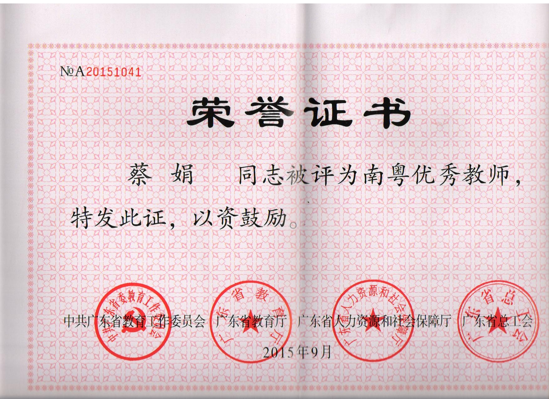 蔡娟老师2015年被广东省教育厅评为南粤优秀教师