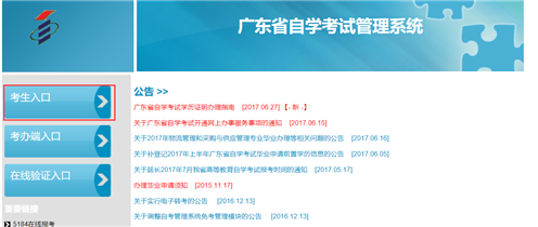 考生登录广东省自学考试管理系统(http://www.stegd.edu.cn/selfec/)点击“考生入口”按钮(见图1)