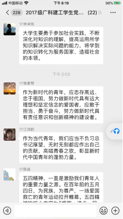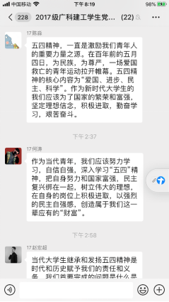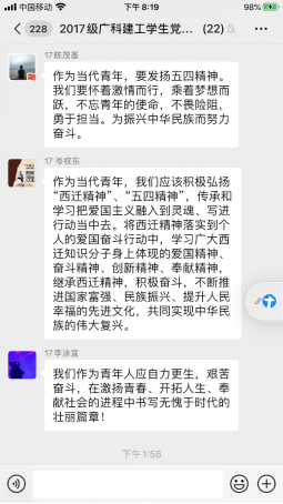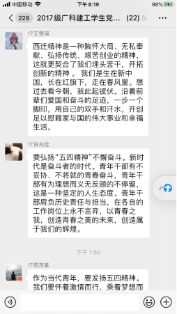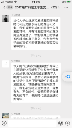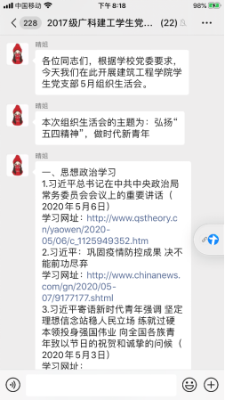 进入五月,随着国家疫情有所好转,在学校防控不松懈的指导前提下,为解决我院党员在疫情防控期间不能集中学习的情况,保障我院党员的思想政治学习教育不掉队,积极响应学校党委利用网络平台,灵活开展“三会一课”的要求。我院学生党支部于5月13日14时30分,通过党支部微信群,开展了弘扬“五四精神”,做时代新青年的主题党日学习。