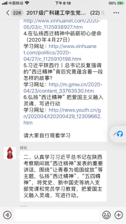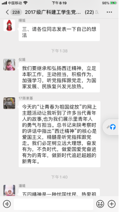 会上,党支部书记温诗晴同志分享相关的思想政治学习资料并指出,当前我们要认真学习习近平总书记在陕西考察期间就“西迁精神”发表的重要讲话。温诗晴书记强调,进入2020年,我们国家出现新冠肺炎、凉山火灾、禽流感等等情况,在灾难面前,党员同志更要与党中央站在一起,树立坚定信念,积极做出表率,发扬共产党人的先锋模范作用。与会的党员同志积极阅读学习资料,并就学习内容,分享自己的学习心得和体会,在群内展开讨论。