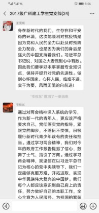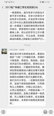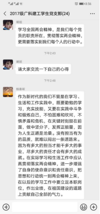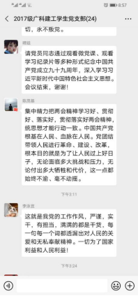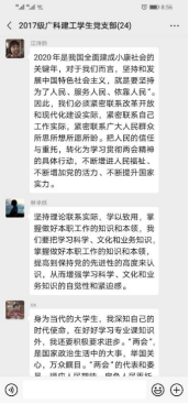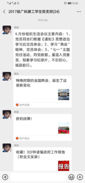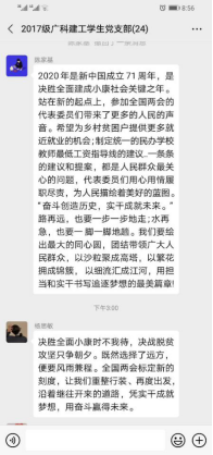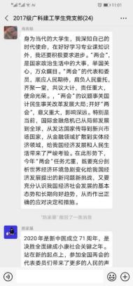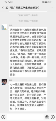 2020年6月24日星期三14时39分,建筑工程学院2017级学生党支部在“七·一”到来之际,通过党支部教育学习微信群,召开“向党致敬”主题党日学习教育活动。会议由学生党支部书记温诗晴主持。