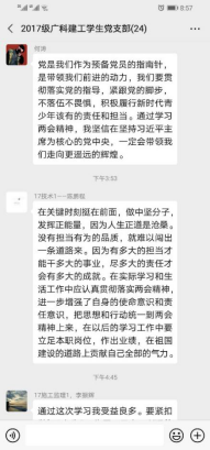 学生党员纷纷表示,要以身作则,发挥党员先锋模范作用,现在在外面实习工作中,做好工作本职,同时利用个人时间,组织做好班级的各项工作,确保学校的毕业前相关工作都能以班级为单位得到完成和落实。积极响应学校的号召,做好疫情期间的防疫工作,做好表率,坚持打赢疫情攻坚战。