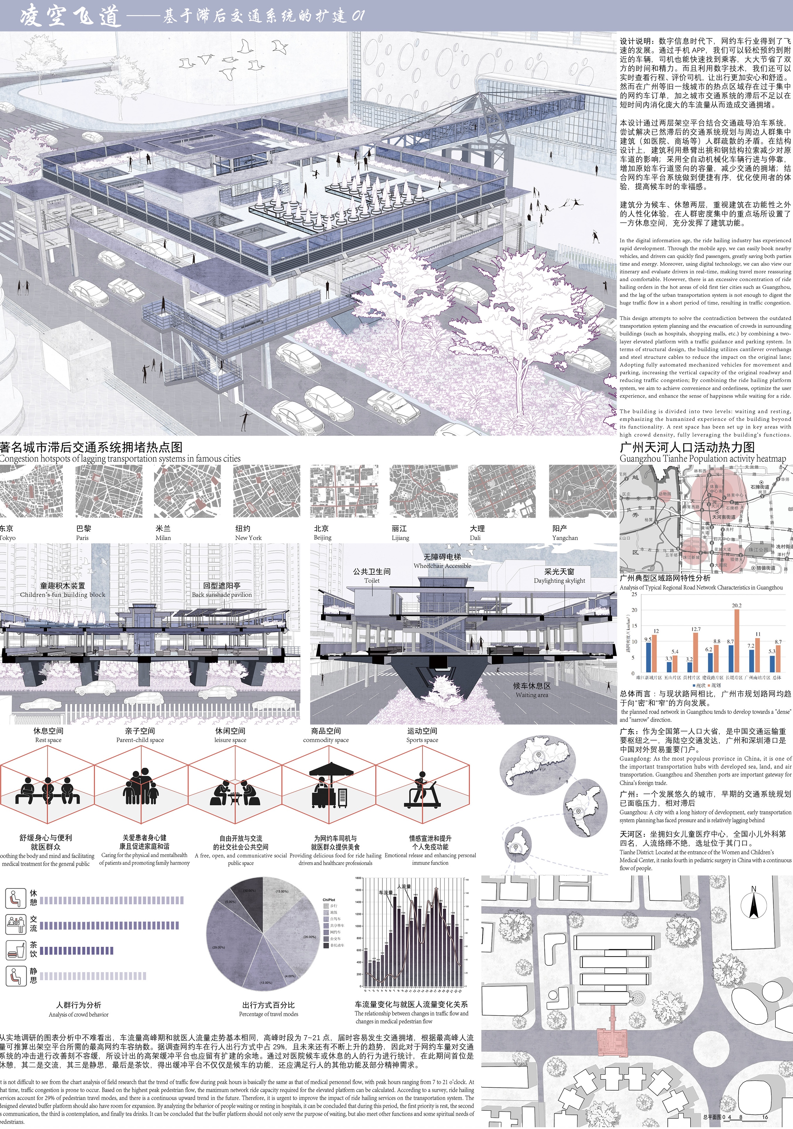 陈善东、彭佩玟同学以“凌空飞道--基于滞后交通系统的扩建”为主题,以建筑为载体,探讨数字信息时代下,城市高密度区域交通系统的创新设计。