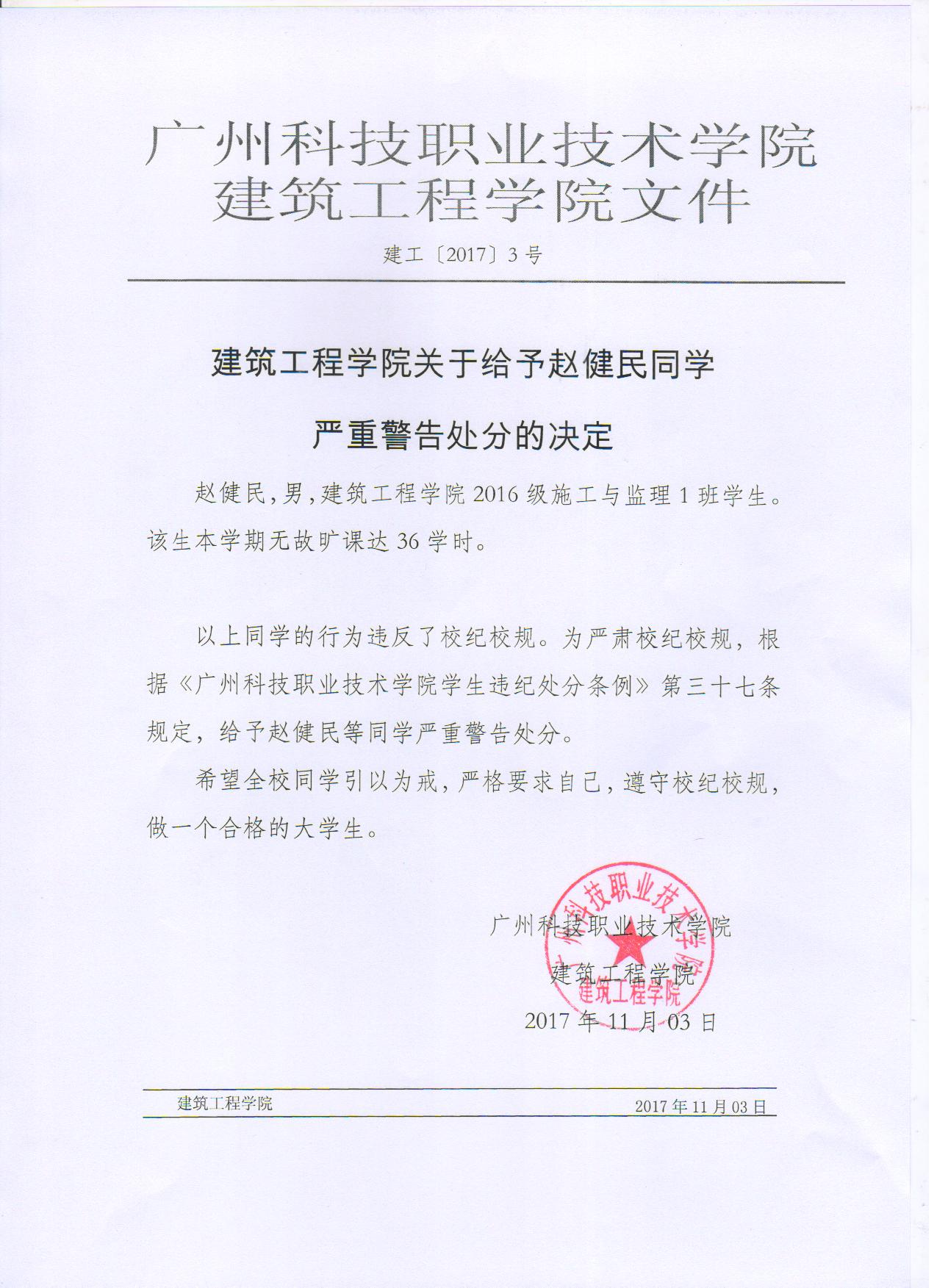 建筑工程学院关于给予赵健民同学严重警告处分的决定