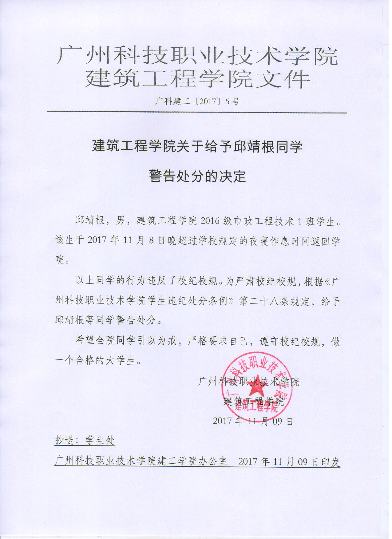 建筑工程学院关于给予邱靖根等同学警告处分的决定