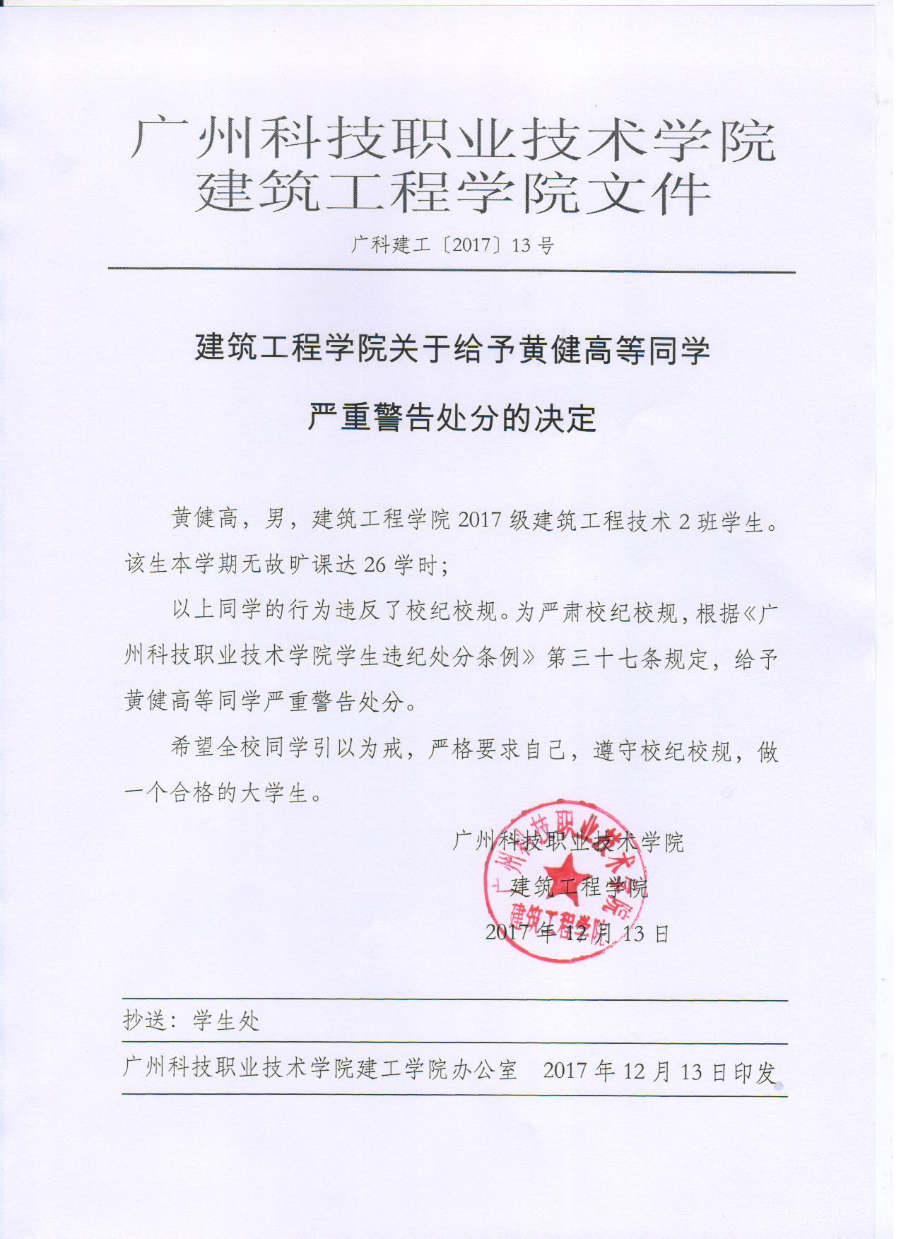 建筑工程学院关于给予黄健高等同学严重警告处分的决定