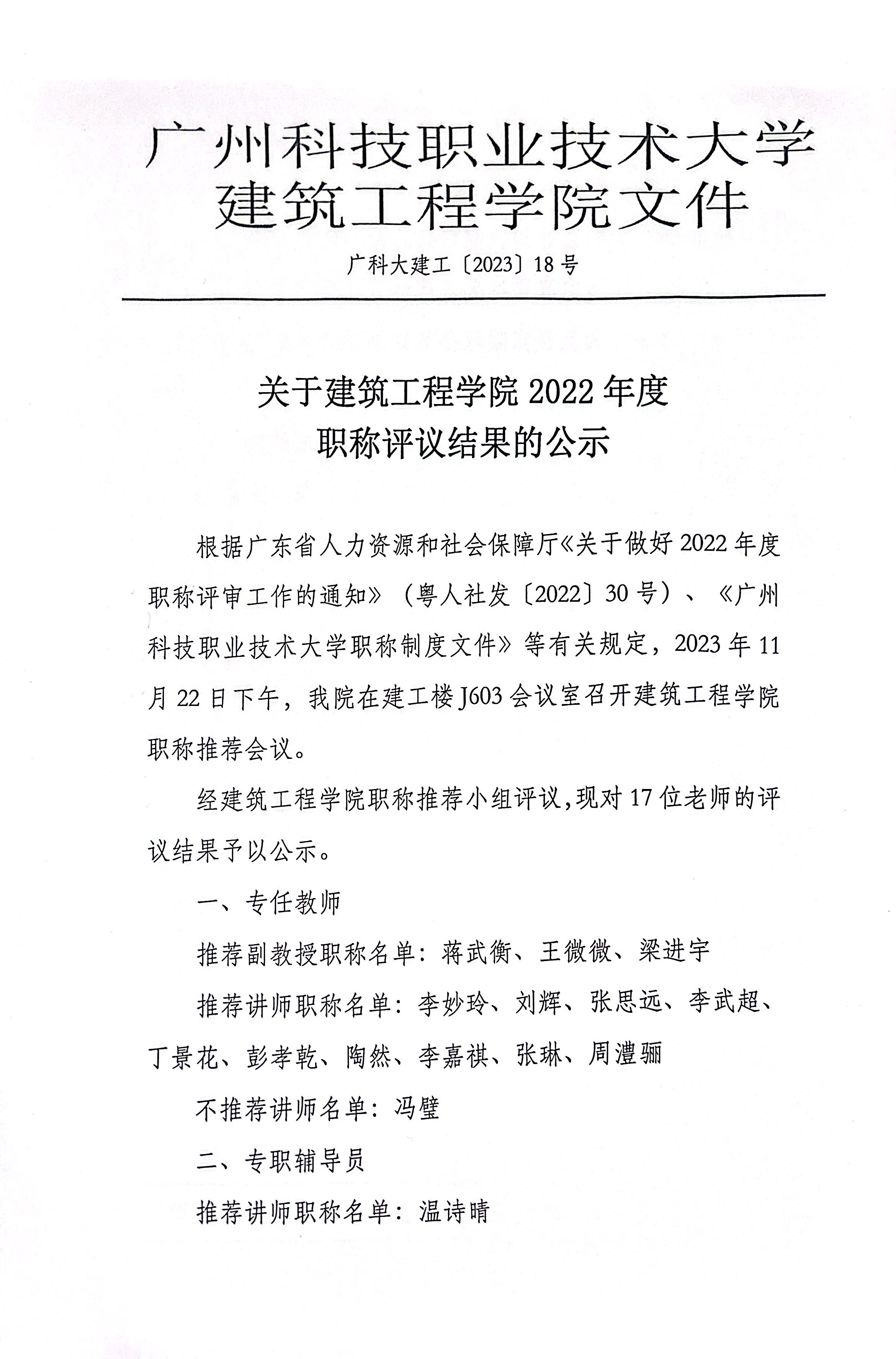 根据广东省人力资源和社会保障厅《关于做好2022年度职称评审工作的通知》(粤人社发〔2022〕30号)、《华亿在线职称制度文件》等有关规定,2023年11月22日下午,我院在建工楼J603会议室召开建筑工程学院职称推荐会议。