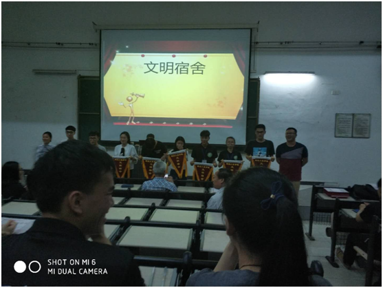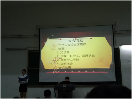 表彰大会分三个部分进行:第一部分表彰在学业方面表现优秀,获得国家奖学金、国家励志奖学金、学校奖学金的学生;第二部分表彰在团总支、学生会、班级活动、学院活动等表现优秀、贡献突出的学生,为其颁发优秀三好学生、三好学生、优秀学生干部等证书;第三部分则表彰在前段时间进行的文明宿舍检查中,获得“文明宿舍”的学生。