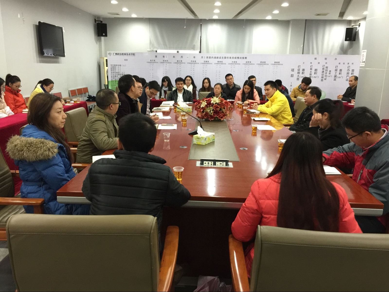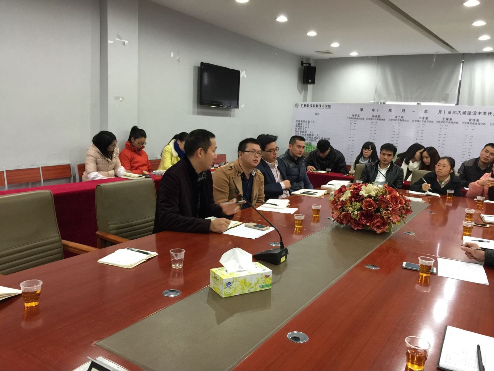 2015年12月9日上午九点三十分在行政楼四楼会议室,广州南洋理工职业学院学生处彭处长带领该校建工系辅导员团队到我校考察交流。我院学生处全体教师及我系辅导员团队全体成员参加了本次交流大会。交流大会由学生处王忠处长主持。双方就学生管理工作进行了交流和经验分享。