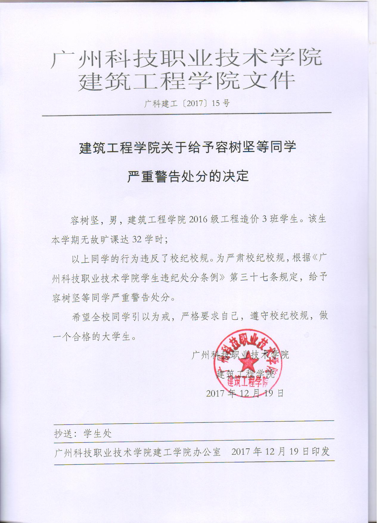 建筑工程学院关于给予容树坚等同学严重警告处分的决定