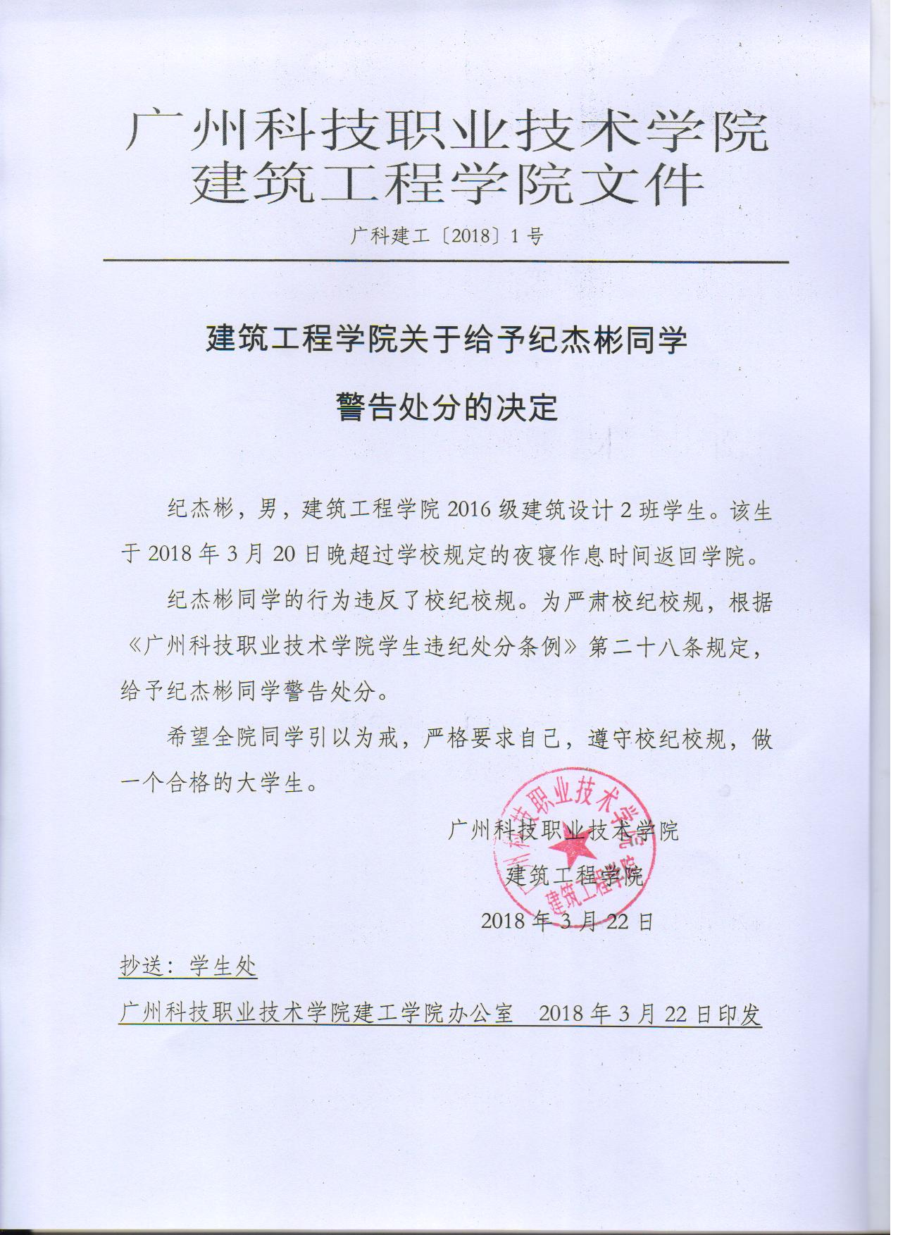 建筑工程学院关于给予纪杰彬同学警告处分的决定
