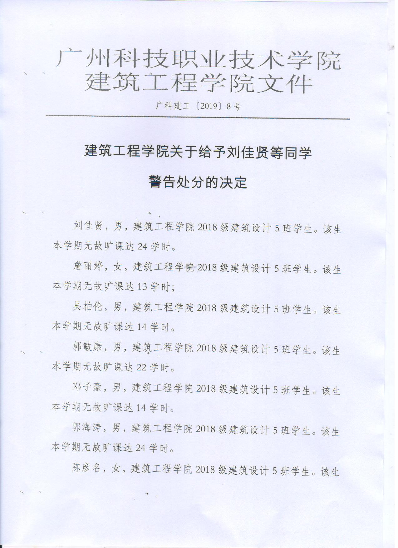 建筑工程学院关于给予刘佳贤等同学警告处分的决定
