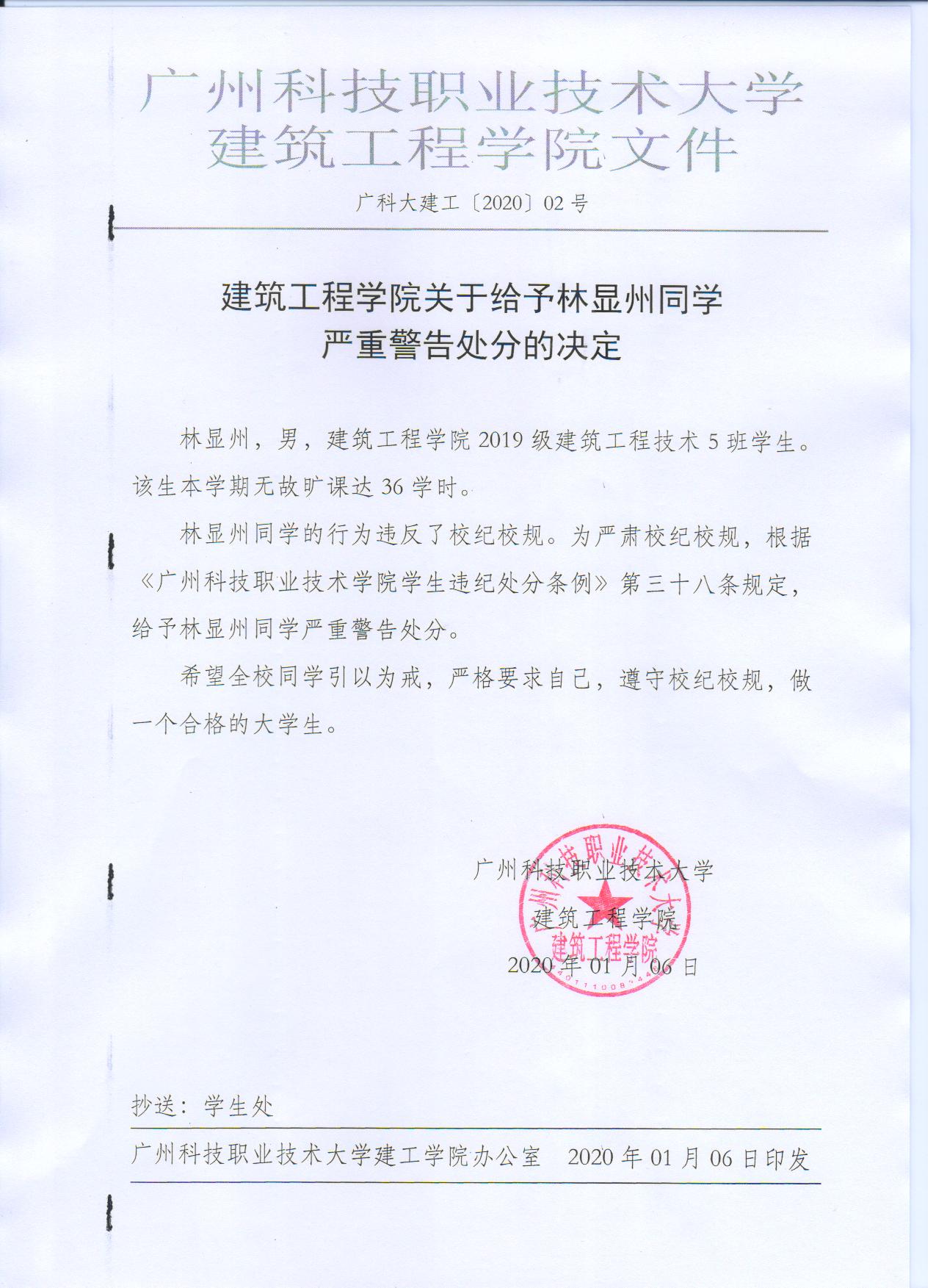 林显州,男,建筑工程学院2019级建筑工程技术5班学生。该生本学期无故旷课达36学时。