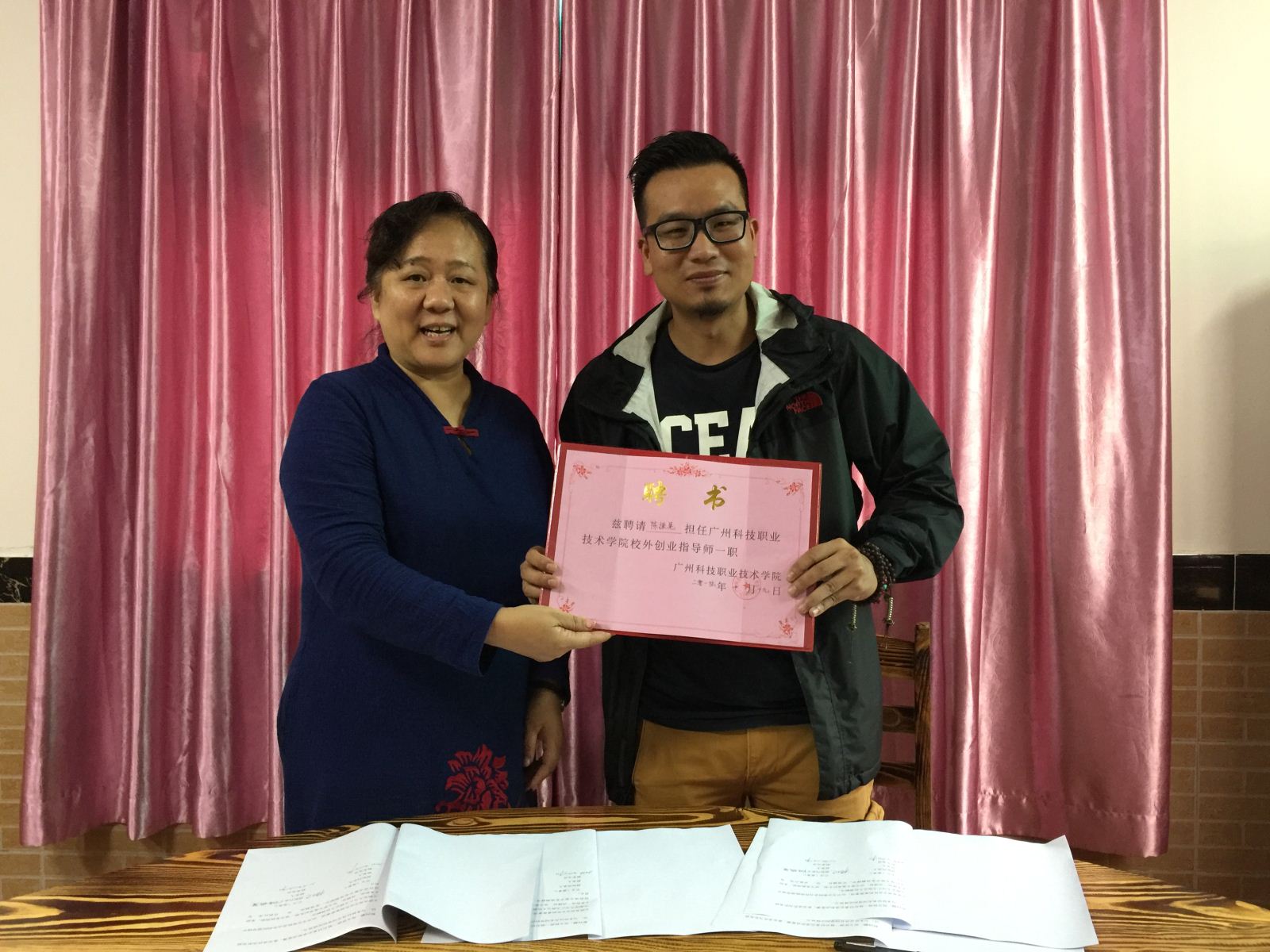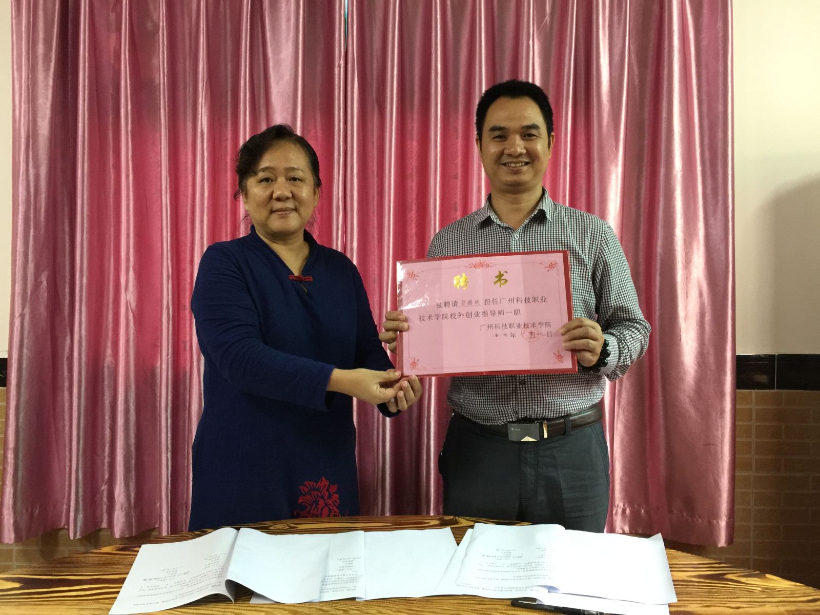 最后,杨院长分别为陈振晃总经理和邹辉映经理,颁发了校外创新创业教育导师的聘书。
