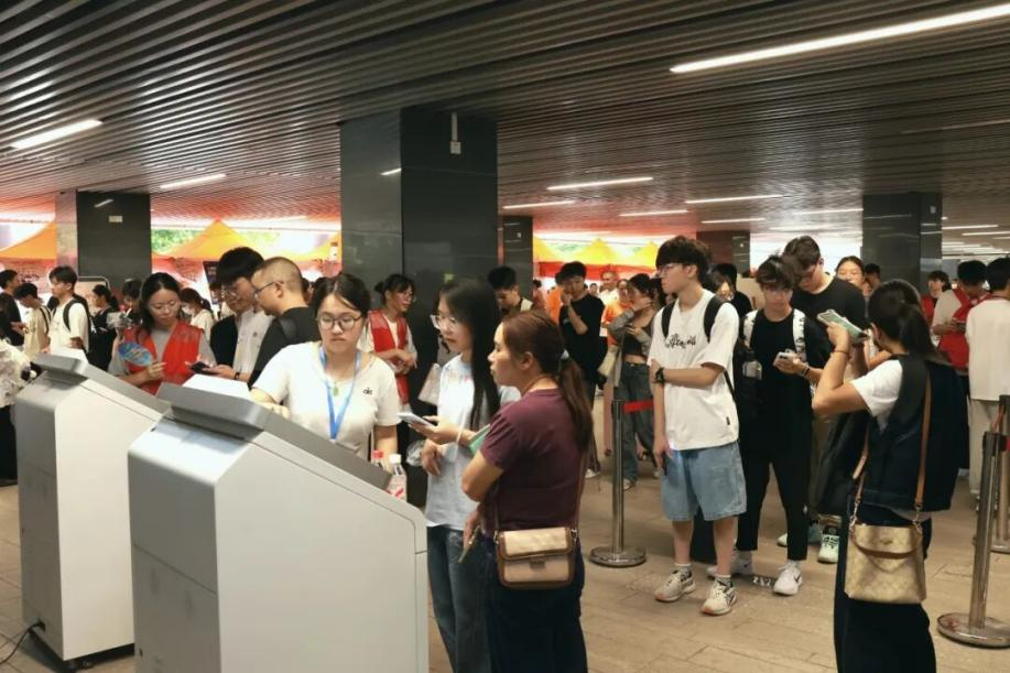 对于未完成线上报到的新生,一站式服务中心依旧高效运转。各学院的志愿者与智能终端协同配合,工作人员协助新生实时调取信息,整个过程流畅有序。